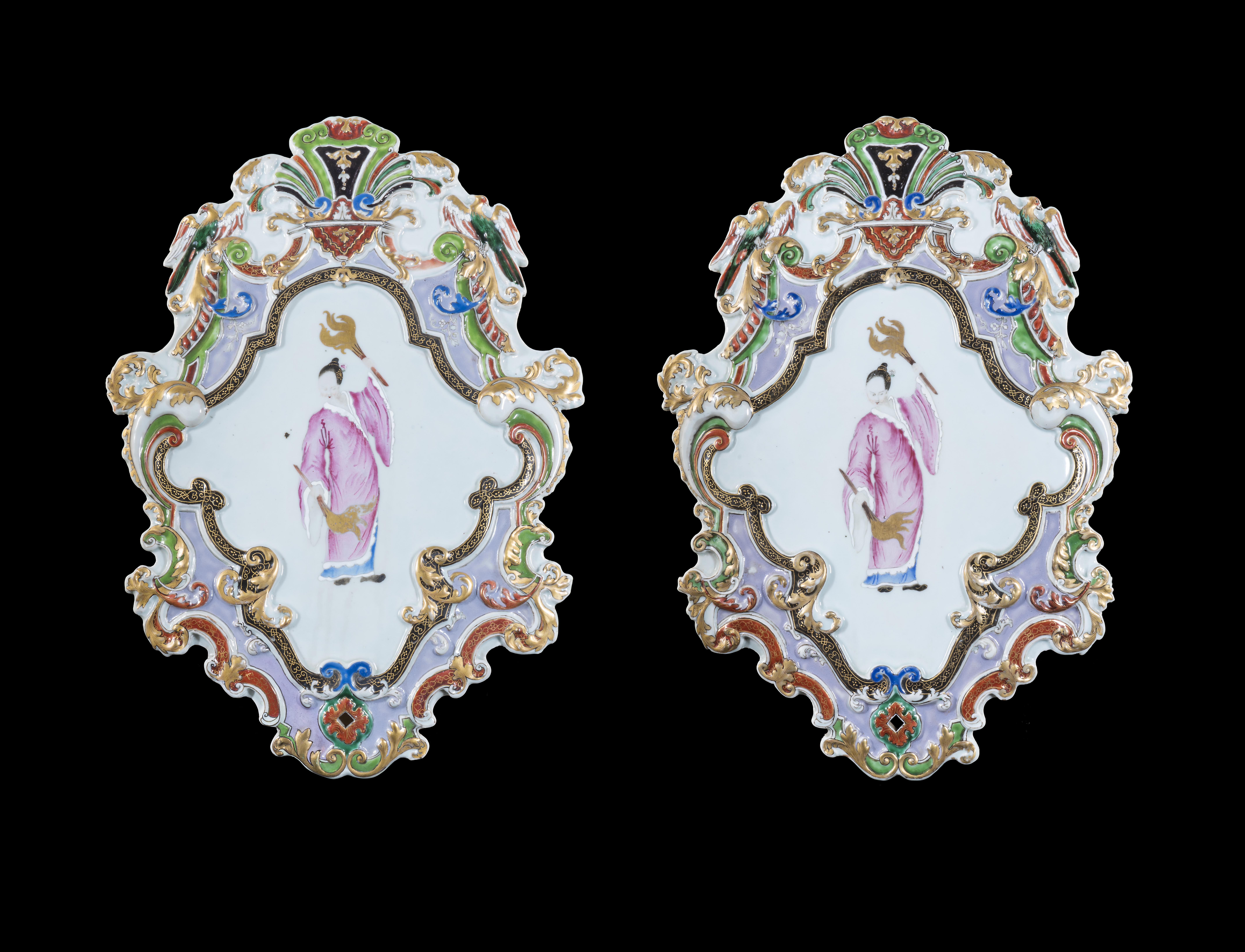 These extremely rare sconces belong to a small group of similar porcelain sconces all attributed to the Pronk workshop. This design, variously known as the ‘torch-bearer’ or the ‘flame-dancer’ is recorded in two versions with different frames. The other is thinner and smaller and does not include the phoenixes in the frame.